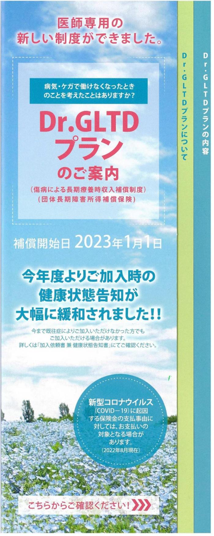 永らく会員の皆様にご愛顧いただいております、団体所得補償保険のオプション団体長期障害所得補償保険がこのたび発売以来約30年経過し、医師専用制度Dr.GLTDプランとしてリニューアルされました。また同じタイミングで健康状態告知も大幅緩和されましたので、今まで加入を見送っていた会員様もこの機会にぜひご検討ください。Dr.GLTDプランは2023年1月1日補償開始です。詳細につきましては TOP>サービス一覧>保険商品 の中にパンフレット「2023団体所得補償保険」をアップしましたのでこちらでご確認下さい。最後の2ページにDr.GLTDプラン専用の別冊パンフレットがございます。なお今年の所得補償保険資料発送予定日は11月10日(木)です。